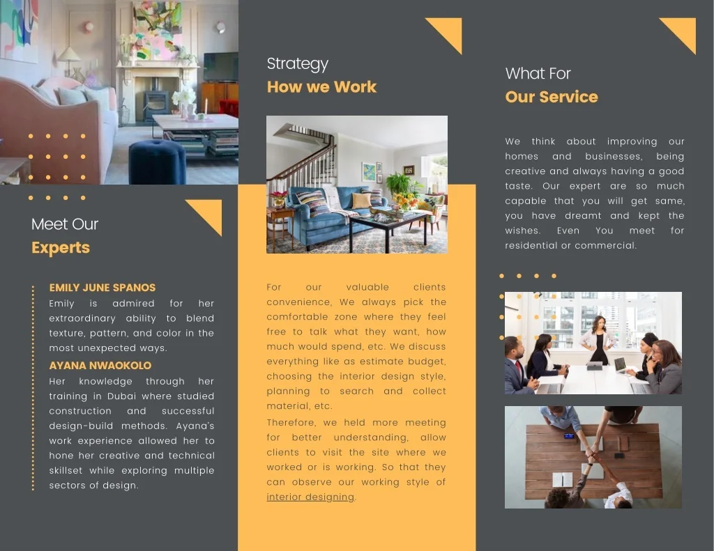 Strategy How we Work What For Our Service We homes creative and always having a good taste. Our expert are so much capable that you will get same, you have dreamt and kept the wishes. residential or commercial. think about and improving businesses, our being Meet Our Experts Even You meet for EMILY JUNE SPANOS Emily extraordinary ability to blend texture, pattern, and color in the most unexpected ways. For convenience, We always pick the comfortable zone where they feel free to talk what they want, how much would spend, etc. We discuss everything like as estimate budget, choosing the interior design style, planning to search and collect material, etc. Therefore, we held more meeting for clients to visit the site where we worked or is working. So that they can observe our working style of interior designing. our valuable clients is admired for her AYANA NWAOKOLO Her training in Dubai where studied construction design-build methods. Ayana’s work experience allowed her to hone her creative and technical skillset while exploring multiple sectors of design. knowledge through her and successful better understanding, allow