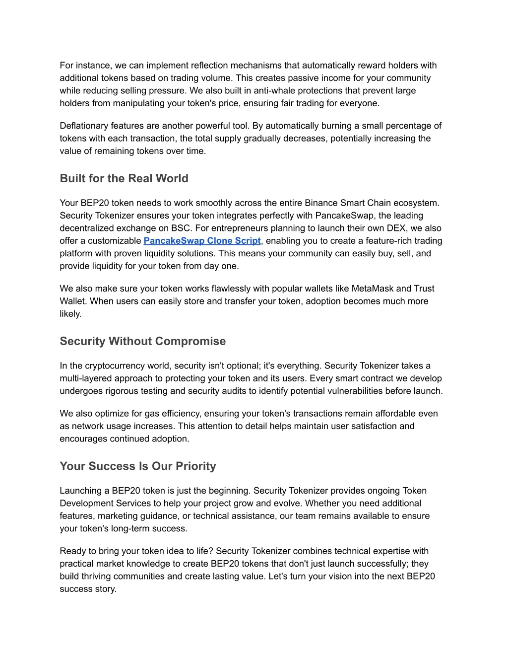 For instance, we can implement reflection mechanisms that automatically reward holders with additional tokens based on trading volume. This creates passive income for your community while reducing selling pressure. We also built in anti-whale protections that prevent large holders from manipulating your token's price, ensuring fair trading for everyone. Deflationary features are another powerful tool. By automatically burning a small percentage of tokens with each transaction, the total supply gradually decreases, potentially increasing the value of remaining tokens over time. Built for the Real World Your BEP20 token needs to work smoothly across the entire Binance Smart Chain ecosystem. Security Tokenizer ensures your token integrates perfectly with PancakeSwap, the leading decentralized exchange on BSC. For entrepreneurs planning to launch their own DEX, we also offer a customizable PancakeSwap Clone Script, enabling you to create a feature-rich trading platform with proven liquidity solutions. This means your community can easily buy, sell, and provide liquidity for your token from day one. We also make sure your token works flawlessly with popular wallets like MetaMask and Trust Wallet. When users can easily store and transfer your token, adoption becomes much more likely. Security Without Compromise In the cryptocurrency world, security isn't optional; it's everything. Security Tokenizer takes a multi-layered approach to protecting your token and its users. Every smart contract we develop undergoes rigorous testing and security audits to identify potential vulnerabilities before launch. We also optimize for gas efficiency, ensuring your token's transactions remain affordable even as network usage increases. This attention to detail helps maintain user satisfaction and encourages continued adoption. Your Success Is Our Priority Launching a BEP20 token is just the beginning. Security Tokenizer provides ongoing Token Development Services to help your project grow and evolve. Whether you need additional features, marketing guidance, or technical assistance, our team remains available to ensure your token's long-term success. Ready to bring your token idea to life? Security Tokenizer combines technical expertise with practical market knowledge to create BEP20 tokens that don't just launch successfully; they build thriving communities and create lasting value. Let's turn your vision into the next BEP20 success story.