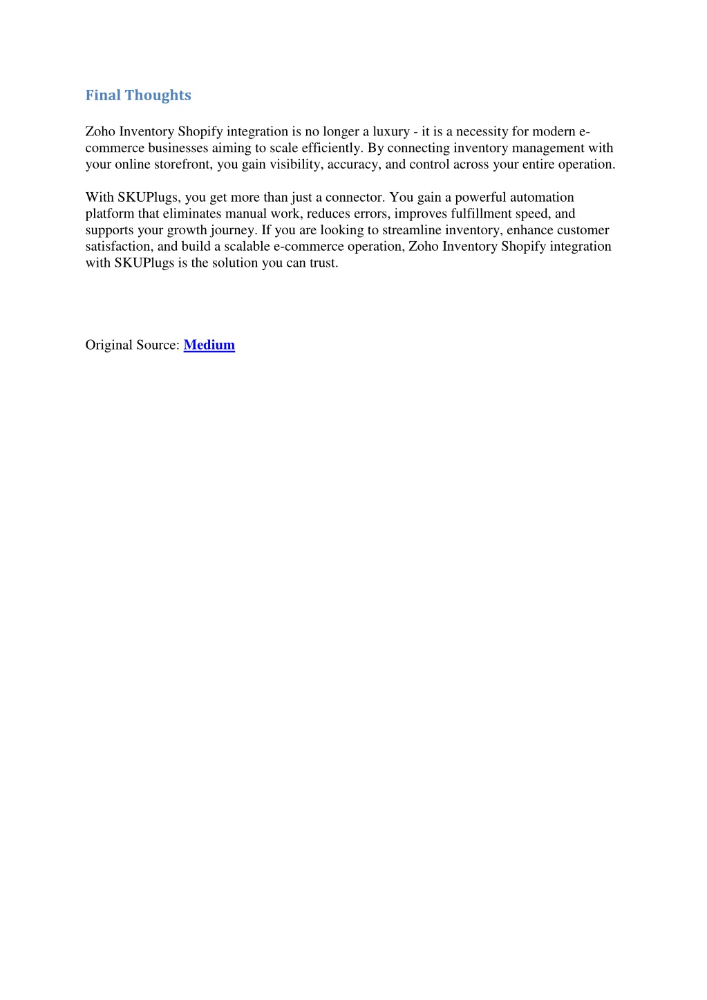 Final Thoughts Zoho Inventory Shopify integration is no longer a luxury - it is a necessity for modern e- commerce businesses aiming to scale efficiently. By connecting inventory management with your online storefront, you gain visibility, accuracy, and control across your entire operation. With SKUPlugs, you get more than just a connector. You gain a powerful automation platform that eliminates manual work, reduces errors, improves fulfillment speed, and supports your growth journey. If you are looking to streamline inventory, enhance customer satisfaction, and build a scalable e-commerce operation, Zoho Inventory Shopify integration with SKUPlugs is the solution you can trust. Original Source: Medium