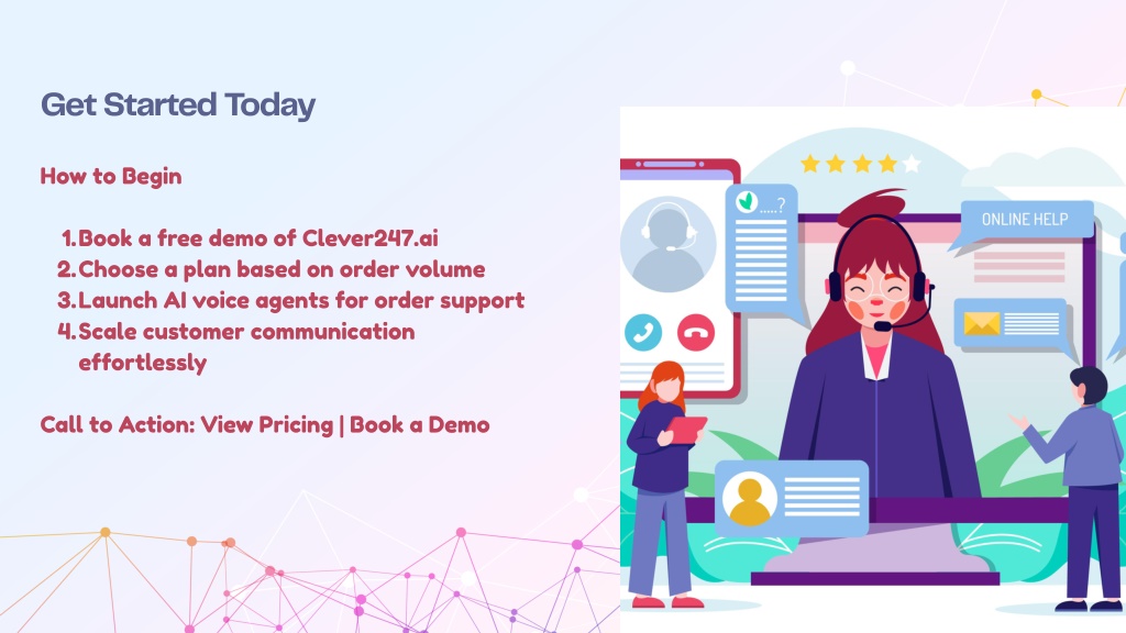 Get Started Today How to Begin 1.Book a free demo of Clever247.ai 2.Choose a plan based on order volume 3.Launch AI voice agents for order support 4.Scale customer communication effortlessly Call to Action: View Pricing | Book a Demo