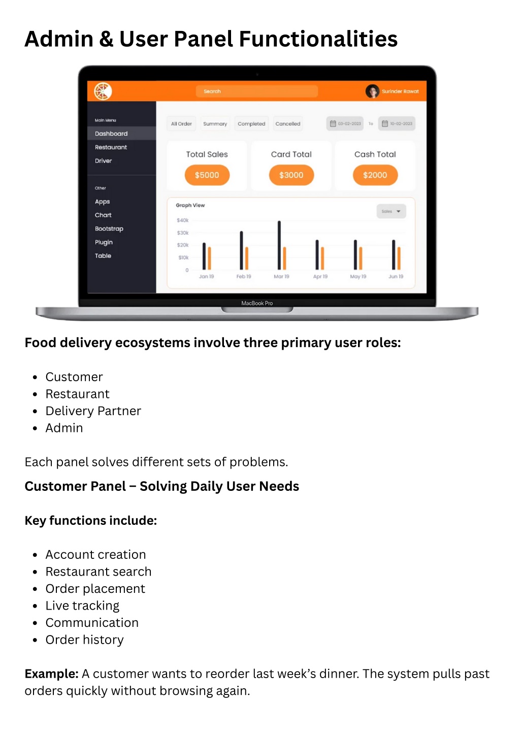 Admin & User Panel Functionalities Food delivery ecosystems involve three primary user roles: Customer Restaurant Delivery Partner Admin Each panel solves different sets of problems. Customer Panel – Solving Daily User Needs Key functions include: Account creation Restaurant search Order placement Live tracking Communication Order history Example: A customer wants to reorder last week’s dinner. The system pulls past orders quickly without browsing again.