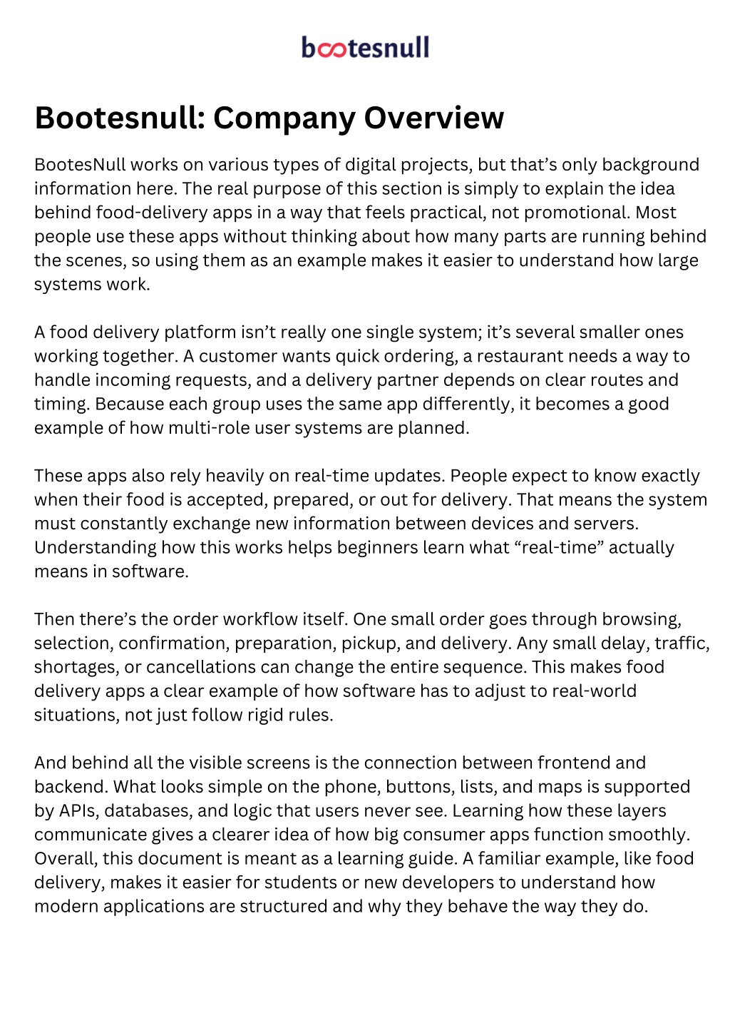 Bootesnull: Company Overview BootesNull works on various types of digital projects, but that’s only background information here. The real purpose of this section is simply to explain the idea behind food-delivery apps in a way that feels practical, not promotional. Most people use these apps without thinking about how many parts are running behind the scenes, so using them as an example makes it easier to understand how large systems work. A food delivery platform isn’t really one single system; it’s several smaller ones working together. A customer wants quick ordering, a restaurant needs a way to handle incoming requests, and a delivery partner depends on clear routes and timing. Because each group uses the same app differently, it becomes a good example of how multi-role user systems are planned. These apps also rely heavily on real-time updates. People expect to know exactly when their food is accepted, prepared, or out for delivery. That means the system must constantly exchange new information between devices and servers. Understanding how this works helps beginners learn what “real-time” actually means in software. Then there’s the order workflow itself. One small order goes through browsing, selection, confirmation, preparation, pickup, and delivery. Any small delay, traffic, shortages, or cancellations can change the entire sequence. This makes food delivery apps a clear example of how software has to adjust to real-world situations, not just follow rigid rules. And behind all the visible screens is the connection between frontend and backend. What looks simple on the phone, buttons, lists, and maps is supported by APIs, databases, and logic that users never see. Learning how these layers communicate gives a clearer idea of how big consumer apps function smoothly. Overall, this document is meant as a learning guide. A familiar example, like food delivery, makes it easier for students or new developers to understand how modern applications are structured and why they behave the way they do.