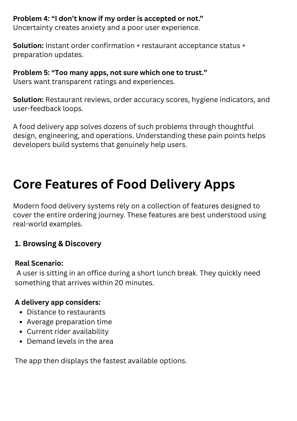 Problem 4: “I don’t know if my order is accepted or not.” Uncertainty creates anxiety and a poor user experience. Solution: Instant order confirmation + restaurant acceptance status + preparation updates. Problem 5: “Too many apps, not sure which one to trust.” Users want transparent ratings and experiences. Solution: Restaurant reviews, order accuracy scores, hygiene indicators, and user-feedback loops. A food delivery app solves dozens of such problems through thoughtful design, engineering, and operations. Understanding these pain points helps developers build systems that genuinely help users. Core Features of Food Delivery Apps Modern food delivery systems rely on a collection of features designed to cover the entire ordering journey. These features are best understood using real-world examples. 1. Browsing & Discovery Real Scenario: A user is sitting in an office during a short lunch break. They quickly need something that arrives within 20 minutes. A delivery app considers: Distance to restaurants Average preparation time Current rider availability Demand levels in the area The app then displays the fastest available options.