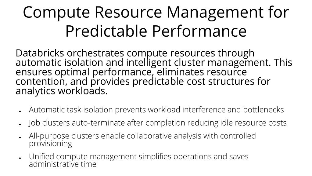 7. Compute Resource Management for Predictable Performance Databricks orchestrates compute resources through automatic isolation and intelligent cluster management. This ensures optimal performance, eliminates resource contention, and provides predictable cost structures for analytics workloads. • Automatic task isolation prevents workload interference and bottlenecks • Job clusters auto-terminate after completion reducing idle resource costs • All-purpose clusters enable collaborative analysis with controlled provisioning • Unified compute management simplifies operations and saves administrative time