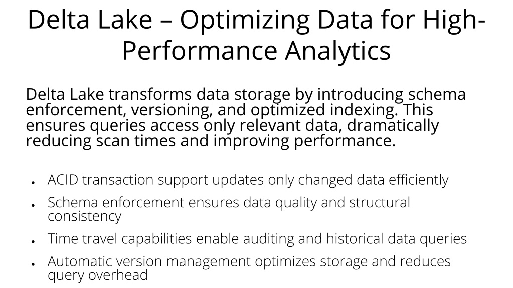 5. Delta Lake – Optimizing Data for High-Performance Analytics Delta Lake transforms data storage by introducing schema enforcement, versioning, and optimized indexing. This ensures queries access only relevant data, dramatically reducing scan times and improving performance. • ACID transaction support updates only changed data efficiently • Schema enforcement ensures data quality and structural consistency • Time travel capabilities enable auditing and historical data queries • Automatic version management optimizes storage and reduces query overhead