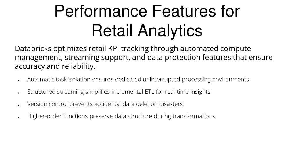 6. Performance Features for Retail Analytics Databricks optimizes retail KPI tracking through automated compute management, streaming support, and data protection features that ensure accuracy and reliability. • Automatic task isolation ensures dedicated uninterrupted processing environments • Structured streaming simplifies incremental ETL for real-time insights • Version control prevents accidental data deletion disasters • Higher-order functions preserve data structure during transformations
