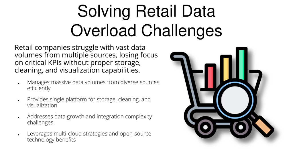 3. Solving Retail Data Overload Challenges Retail companies struggle with vast data volumes from multiple sources, losing focus on critical KPIs without proper storage, cleaning, and visualization capabilities. • Manages massive data volumes from diverse sources efficiently • Provides single platform for storage, cleaning, and visualization • Addresses data growth and integration complexity challenges • Leverages multi-cloud strategies and open-source technology benefits