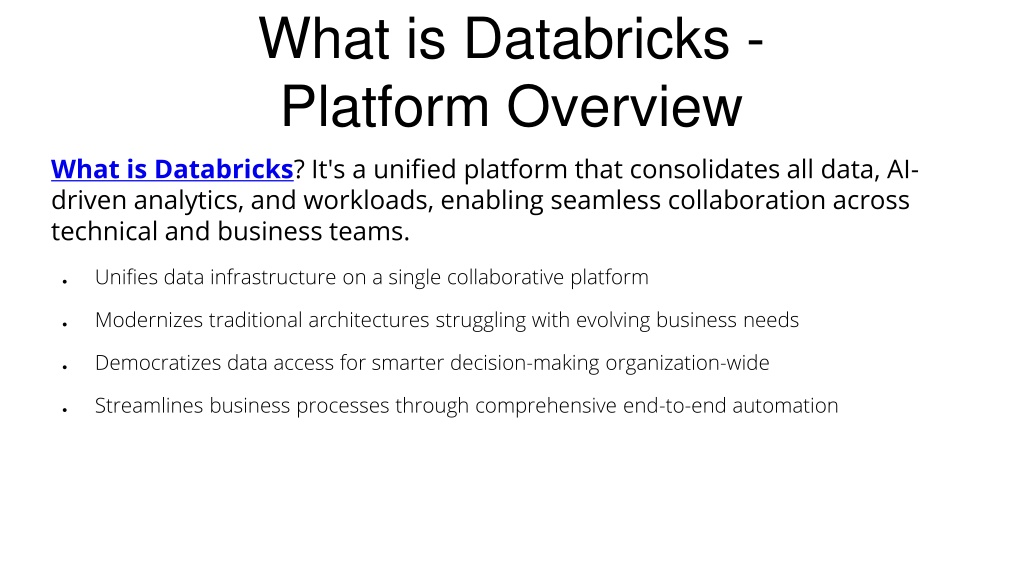 2. What is Databricks - Platform Overview What is Databricks? It's a unified platform that consolidates all data, AI-driven analytics, and workloads, enabling seamless collaboration across technical and business teams. • Unifies data infrastructure on a single collaborative platform • Modernizes traditional architectures struggling with evolving business needs • Democratizes data access for smarter decision-making organization-wide • Streamlines business processes through comprehensive end-to-end automation