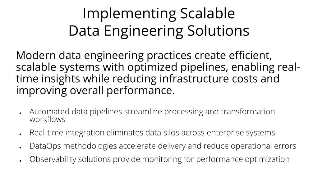 Implementing Scalable Data Engineering Solutions Modern data engineering practices create efficient, scalable systems with optimized pipelines, enabling real-time insights while reducing infrastructure costs and improving overall performance. • Automated data pipelines streamline processing and transformation workflows • Real-time integration eliminates data silos across enterprise systems • DataOps methodologies accelerate delivery and reduce operational errors • Observability solutions provide monitoring for performance optimization