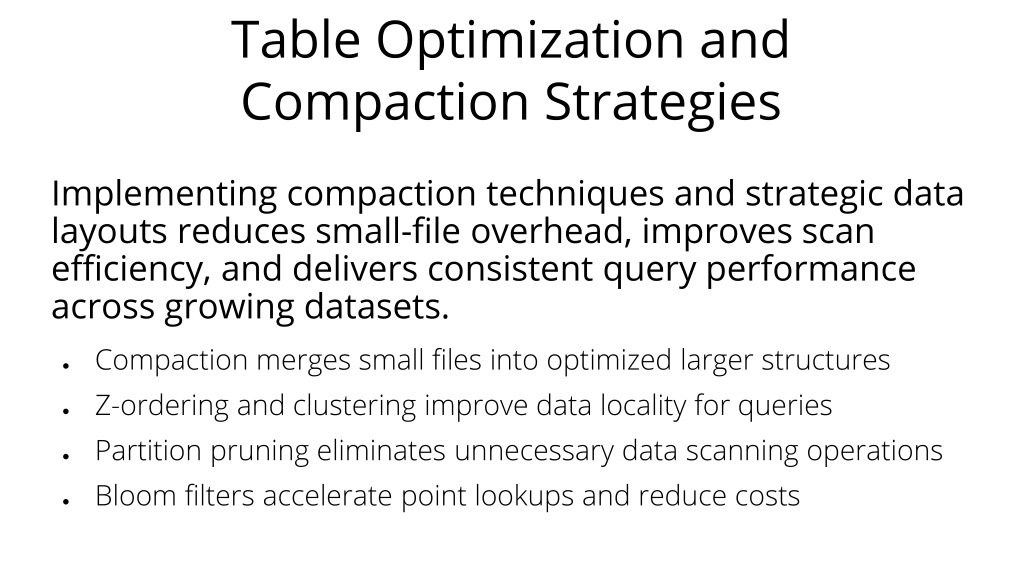 Table Optimization and Compaction Strategies Implementing compaction techniques and strategic data layouts reduces small-file overhead, improves scan efficiency, and delivers consistent query performance across growing datasets. • Compaction merges small files into optimized larger structures • Z-ordering and clustering improve data locality for queries • Partition pruning eliminates unnecessary data scanning operations • Bloom filters accelerate point lookups and reduce costs