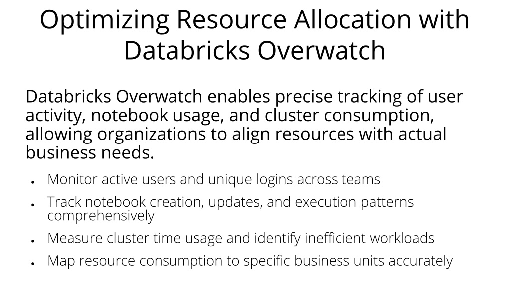 Optimizing Resource Allocation with Databricks Overwatch Databricks Overwatch enables precise tracking of user activity, notebook usage, and cluster consumption, allowing organizations to align resources with actual business needs. • Monitor active users and unique logins across teams • Track notebook creation, updates, and execution patterns comprehensively • Measure cluster time usage and identify inefficient workloads • Map resource consumption to specific business units accurately