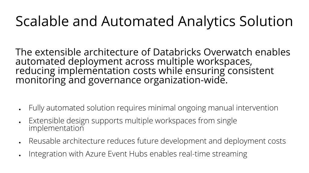Scalable and Automated Analytics Solution The extensible architecture of Databricks Overwatch enables automated deployment across multiple workspaces, reducing implementation costs while ensuring consistent monitoring and governance organization-wide. • Fully automated solution requires minimal ongoing manual intervention • Extensible design supports multiple workspaces from single implementation • Reusable architecture reduces future development and deployment costs • Integration with Azure Event Hubs enables real-time streaming