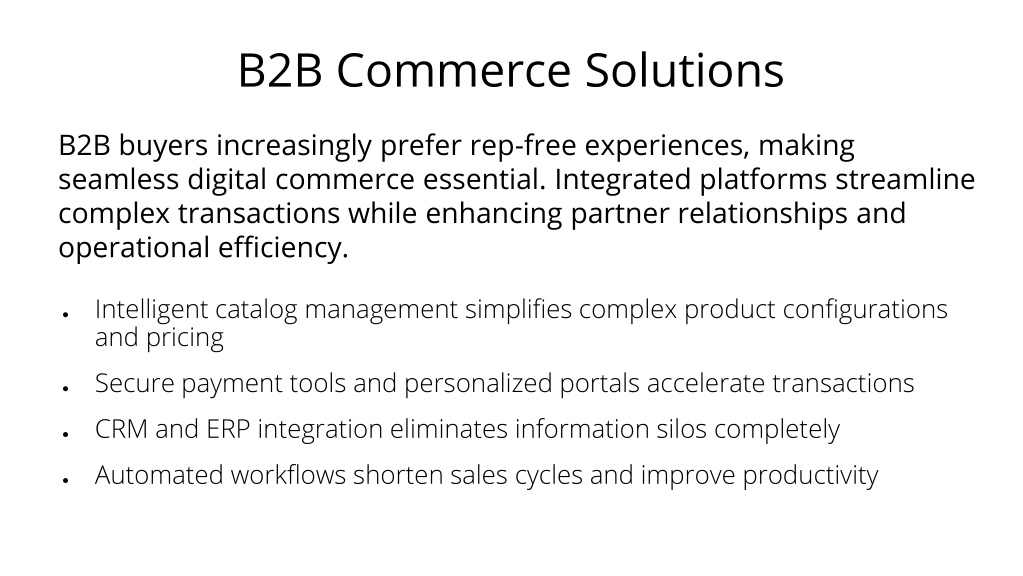B2B Commerce Solutions B2B buyers increasingly prefer rep-free experiences, making seamless digital commerce essential. Integrated platforms streamline complex transactions while enhancing partner relationships and operational efficiency. • Intelligent catalog management simplifies complex product configurations and pricing • Secure payment tools and personalized portals accelerate transactions • CRM and ERP integration eliminates information silos completely • Automated workflows shorten sales cycles and improve productivity