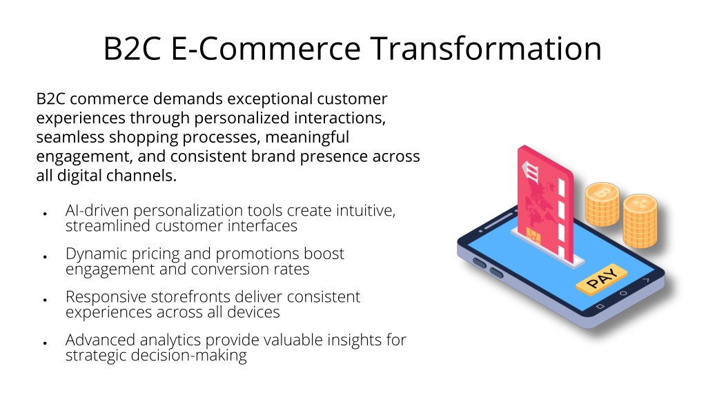 B2C E-Commerce Transformation B2C commerce demands exceptional customer experiences through personalized interactions, seamless shopping processes, meaningful engagement, and consistent brand presence across all digital channels. • AI-driven personalization tools create intuitive, streamlined customer interfaces • Dynamic pricing and promotions boost engagement and conversion rates • Responsive storefronts deliver consistent experiences across all devices • Advanced analytics provide valuable insights for strategic decision-making