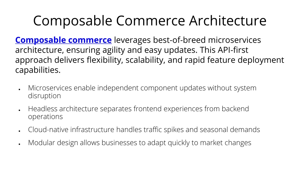Composable Commerce Architecture Composable commerce leverages best-of-breed microservices architecture, ensuring agility and easy updates. This API-first approach delivers flexibility, scalability, and rapid feature deployment capabilities. • Microservices enable independent component updates without system disruption • Headless architecture separates frontend experiences from backend operations • Cloud-native infrastructure handles traffic spikes and seasonal demands • Modular design allows businesses to adapt quickly to market changes