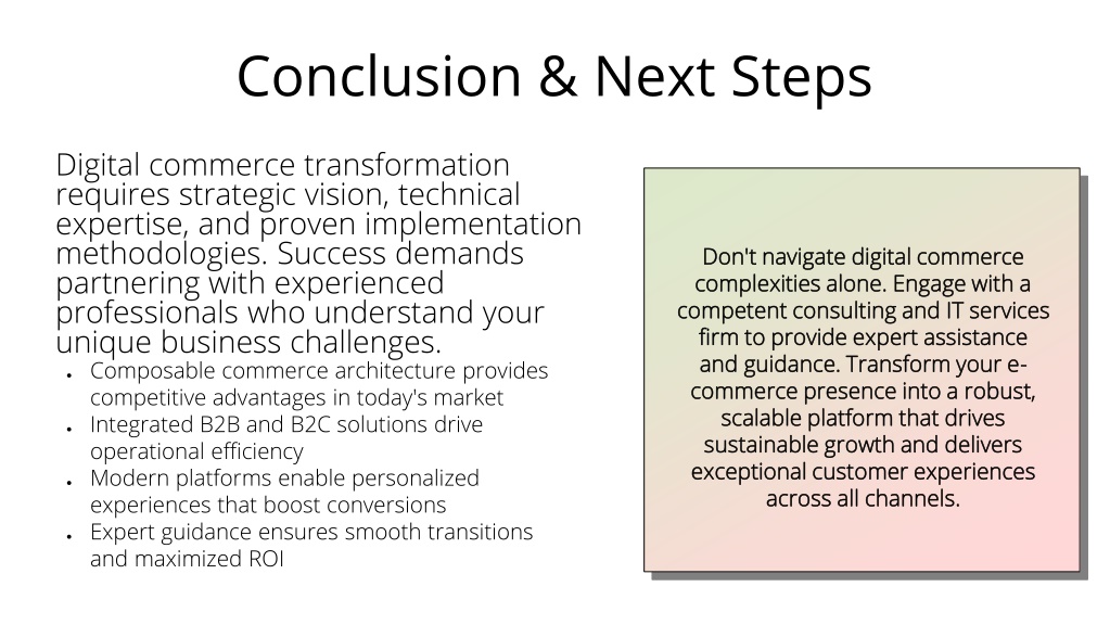 Conclusion & Next Steps Digital commerce transformation requires strategic vision, technical expertise, and proven implementation methodologies. Success demands partnering with experienced professionals who understand your unique business challenges. Don't navigate digital commerce complexities alone. Engage with a competent consulting and IT services firm to provide expert assistance and guidance. Transform your e-commerce presence into a robust, scalable platform that drives sustainable growth and delivers exceptional customer experiences across all channels. • Composable commerce architecture provides competitive advantages in today's market • Integrated B2B and B2C solutions drive operational efficiency • Modern platforms enable personalized experiences that boost conversions • Expert guidance ensures smooth transitions and maximized ROI