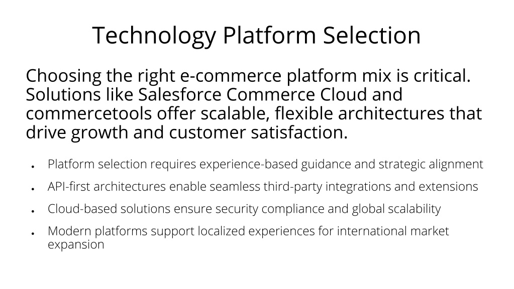 Technology Platform Selection Choosing the right e-commerce platform mix is critical. Solutions like Salesforce Commerce Cloud and commercetools offer scalable, flexible architectures that drive growth and customer satisfaction. • Platform selection requires experience-based guidance and strategic alignment • API-first architectures enable seamless third-party integrations and extensions • Cloud-based solutions ensure security compliance and global scalability • Modern platforms support localized experiences for international market expansion