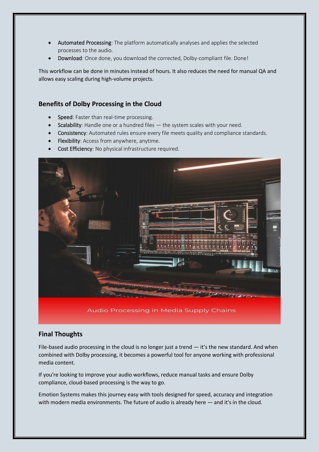 •Automated Processing Automated Processing: The platform automatically analyses and applies the selected processes to the audio. •Download Download: Once done, you download the corrected, Dolby-compliant file. Done! This workflow can be done in minutes instead of hours. It also reduces the need for manual QA and allows easy scaling during high-volume projects. Benefits of Dolby Processing in the Cloud •Speed Speed: Faster than real-time processing. •Scalability Scalability: Handle one or a hundred files — the system scales with your need. •Consistency Consistency: Automated rules ensure every file meets quality and compliance standards. •Flexibility Flexibility: Access from anywhere, anytime. •Cost Efficiency Cost Efficiency: No physical infrastructure required. Final Thoughts File-based audio processing in the cloud is no longer just a trend —it’s the new standard. And when combined with Dolby processing, it becomes a powerful tool for anyone working with professional media content. If you're looking to improve your audio workflows, reduce manual tasks and ensure Dolby compliance, cloud-based processing is the way to go. Emotion Systems makes this journey easy with tools designed for speed, accuracy and integration with modern media environments. The future of audio is already here — and it's in the cloud.