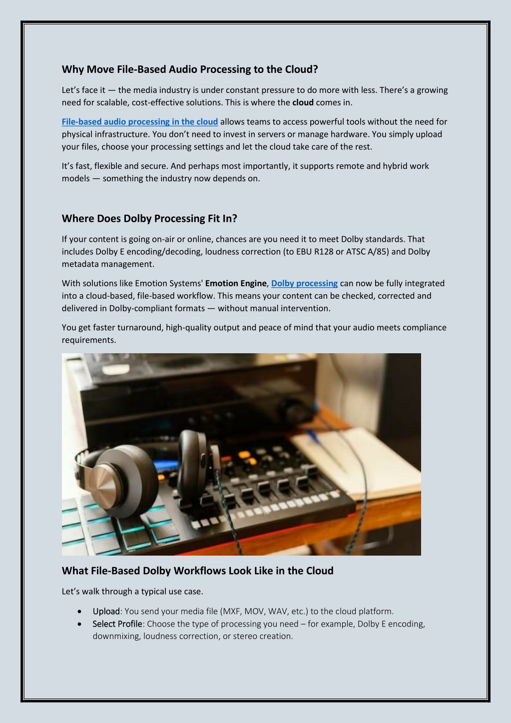 Why Move File-Based Audio Processing to the Cloud? Let’s face it —the media industry is under constant pressure to do more with less. There’s a growing need for scalable, cost-effective solutions. This is where the cloud comes in. File-based audio processing in the cloud allows teams to access powerful tools without the need for physical infrastructure. You don’t need to invest in servers or manage hardware. You simply upload your files, choose your processing settings and let the cloud take care of the rest. It’s fast, flexible and secure. And perhaps most importantly, it supports remote and hybrid work models — something the industry now depends on. Where Does Dolby Processing Fit In? If your content is going on-air or online, chances are you need it to meet Dolby standards. That includes Dolby E encoding/decoding, loudness correction (to EBU R128 or ATSC A/85) and Dolby metadata management. With solutions like Emotion Systems' Emotion Engine, Dolby processing can now be fully integrated into a cloud-based, file-based workflow. This means your content can be checked, corrected and delivered in Dolby-compliant formats — without manual intervention. You get faster turnaround, high-quality output and peace of mind that your audio meets compliance requirements. What File-Based Dolby Workflows Look Like in the Cloud Let’s walk through a typical use case. •Upload Upload: You send your media file (MXF, MOV, WAV, etc.) to the cloud platform. •Select Profile Select Profile: Choose the type of processing you need – for example, Dolby E encoding, downmixing, loudness correction, or stereo creation.