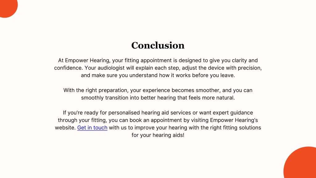 Conclusion • At Empower Hearing, your fitting appointment is designed to give you clarity and confidence. Your audiologist will explain each step, adjust the device with precision, and make sure you understand how it works before you leave. • With the right preparation, your experience becomes smoother, and you can smoothly transition into better hearing that feels more natural. • If you’re ready for personalised hearing aid services or want expert guidance through your fitting, you can book an appointment by visiting Empower Hearing’s website. Get in touch with us to improve your hearing with the right fitting solutions for your hearing aids!