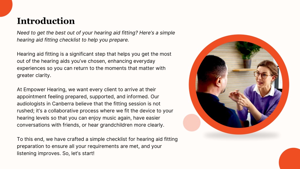 Introduction • Need to get the best out of your hearing aid fitting? Here’s a simple hearing aid fitting checklist to help you prepare. • Hearing aid fitting is a significant step that helps you get the most out of the hearing aids you’ve chosen, enhancing everyday experiences so you can return to the moments that matter with greater clarity. • At Empower Hearing, we want every client to arrive at their appointment feeling prepared, supported, and informed. Our audiologists in Canberra believe that the fitting session is not rushed; it’s a collaborative process where we fit the device to your hearing levels so that you can enjoy music again, have easier conversations with friends, or hear grandchildren more clearly. • To this end, we have crafted a simple checklist for hearing aid fitting preparation to ensure all your requirements are met, and your listening improves. So, let’s start!