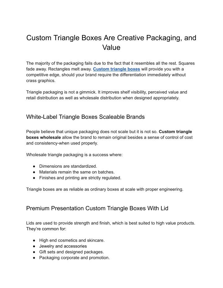 Custom Triangle Boxes Are Creative Packaging, and Value The majority of the packaging fails due to the fact that it resembles all the rest. Squares fade away. Rectangles melt away. Custom triangle boxes will provide you with a competitive edge, should your brand require the differentiation immediately without crass graphics. Triangle packaging is not a gimmick. It improves shelf visibility, perceived value and retail distribution as well as wholesale distribution when designed appropriately. White-Label Triangle Boxes Scaleable Brands People believe that unique packaging does not scale but it is not so. Custom triangle boxes wholesale allow the brand to remain original besides a sense of control of cost and consistency-when used properly. Wholesale triangle packaging is a success where: ● Dimensions are standardized. ● Materials remain the same on batches. ● Finishes and printing are strictly regulated. Triangle boxes are as reliable as ordinary boxes at scale with proper engineering. Premium Presentation Custom Triangle Boxes With Lid Lids are used to provide strength and finish, which is best suited to high value products. They’re common for: ● High end cosmetics and skincare. ● Jewelry and accessories ● Gift sets and designed packages. ● Packaging corporate and promotion.