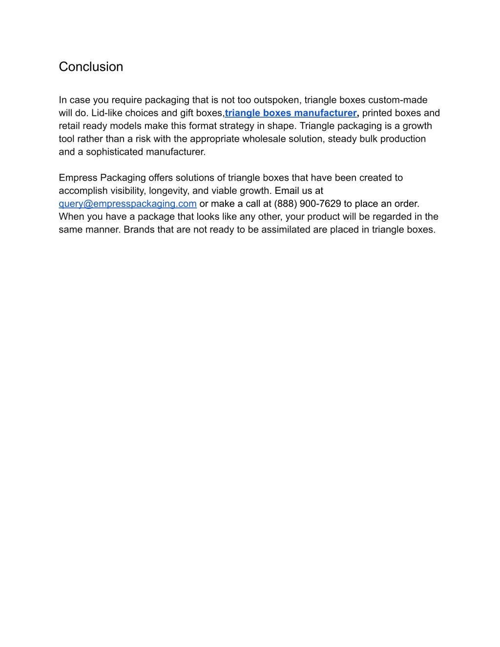 Conclusion In case you require packaging that is not too outspoken, triangle boxes custom-made will do. Lid-like choices and gift boxes,triangle boxes manufacturer, printed boxes and retail ready models make this format strategy in shape. Triangle packaging is a growth tool rather than a risk with the appropriate wholesale solution, steady bulk production and a sophisticated manufacturer. Empress Packaging offers solutions of triangle boxes that have been created to accomplish visibility, longevity, and viable growth. Email us at query@empresspackaging.com or make a call at (888) 900-7629 to place an order. When you have a package that looks like any other, your product will be regarded in the same manner. Brands that are not ready to be assimilated are placed in triangle boxes.