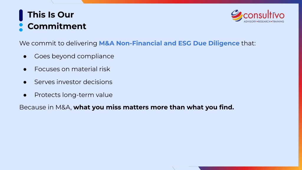 This Is Our Commitment We commit to delivering M&A Non-Financial and ESG Due Diligence that: Goes beyond compliance ● Focuses on material risk ● Serves investor decisions ● Protects long-term value ● Because in M&A, what you miss matters more than what you find.