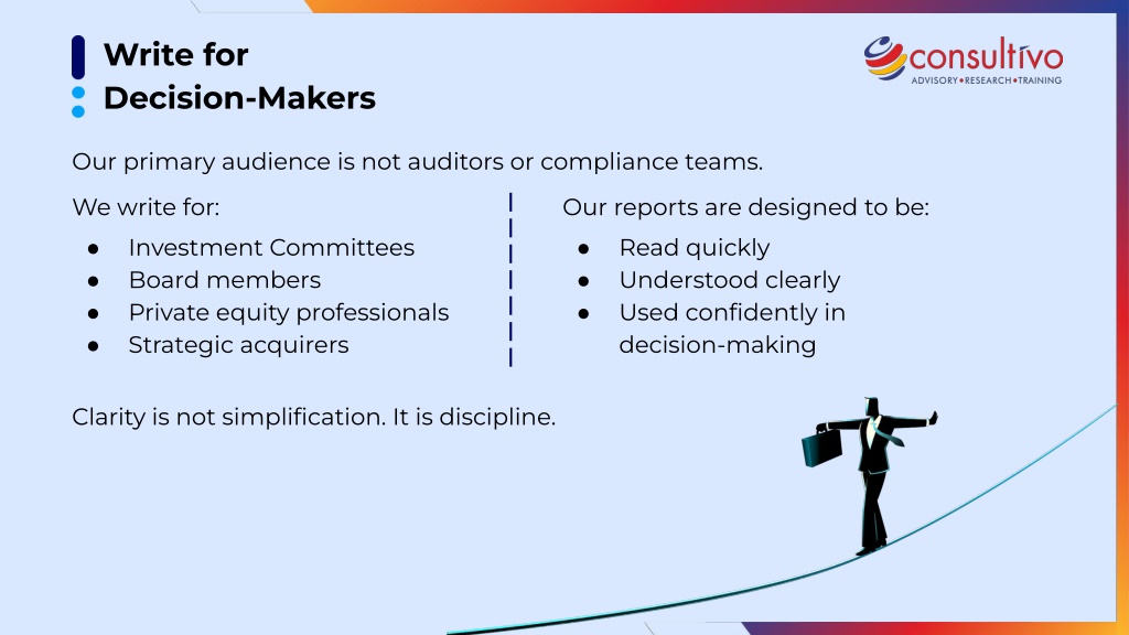Write for Decision-Makers Our primary audience is not auditors or compliance teams. We write for: Investment Committees ● Board members ● Private equity professionals ● Strategic acquirers Our reports are designed to be: Read quickly ● Understood clearly ● Used confidently in decision-making ● ● Clarity is not simplification. It is discipline.