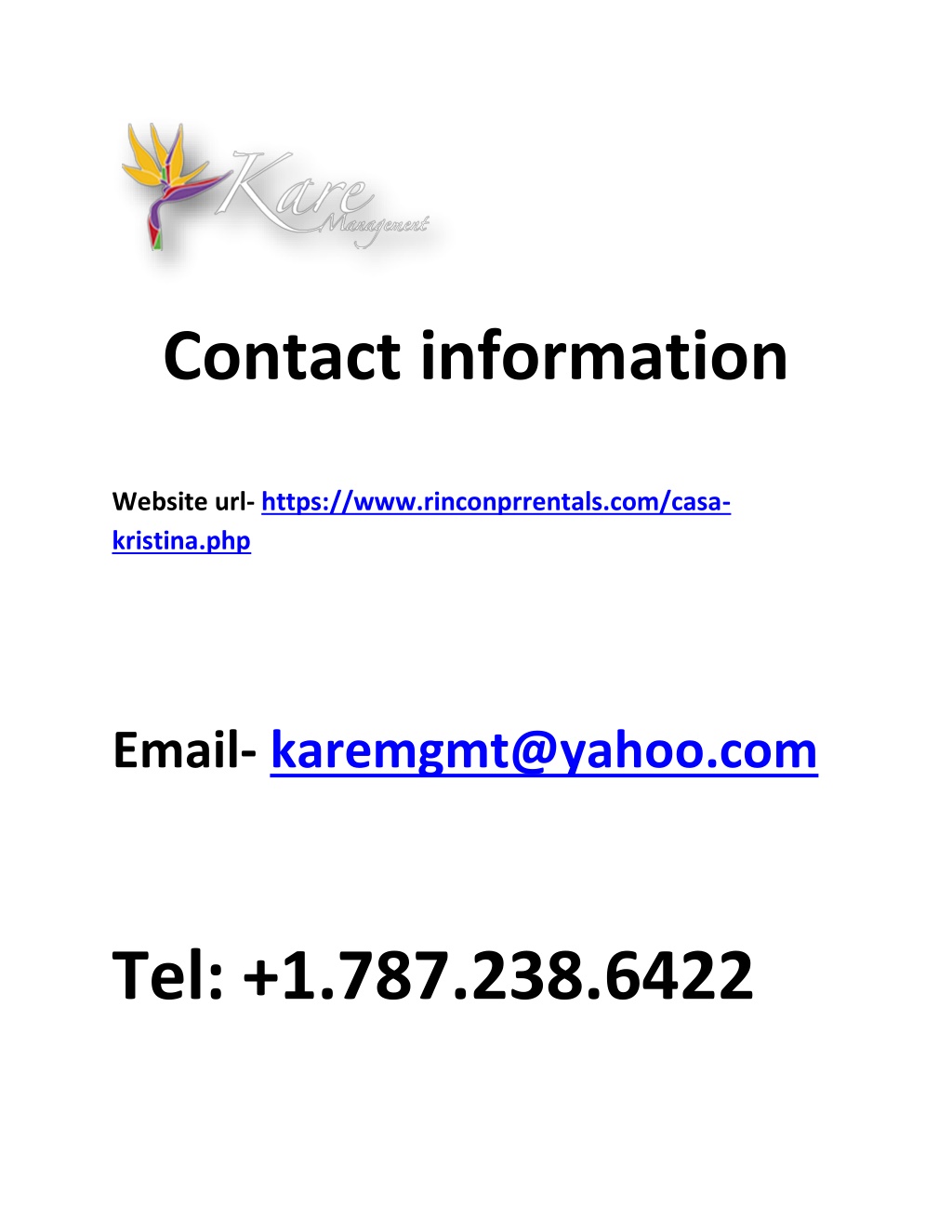 Contact information Website url- https://www.rinconprrentals.com/casa- kristina.php Email- karemgmt@yahoo.com Tel: +1.787.238.6422