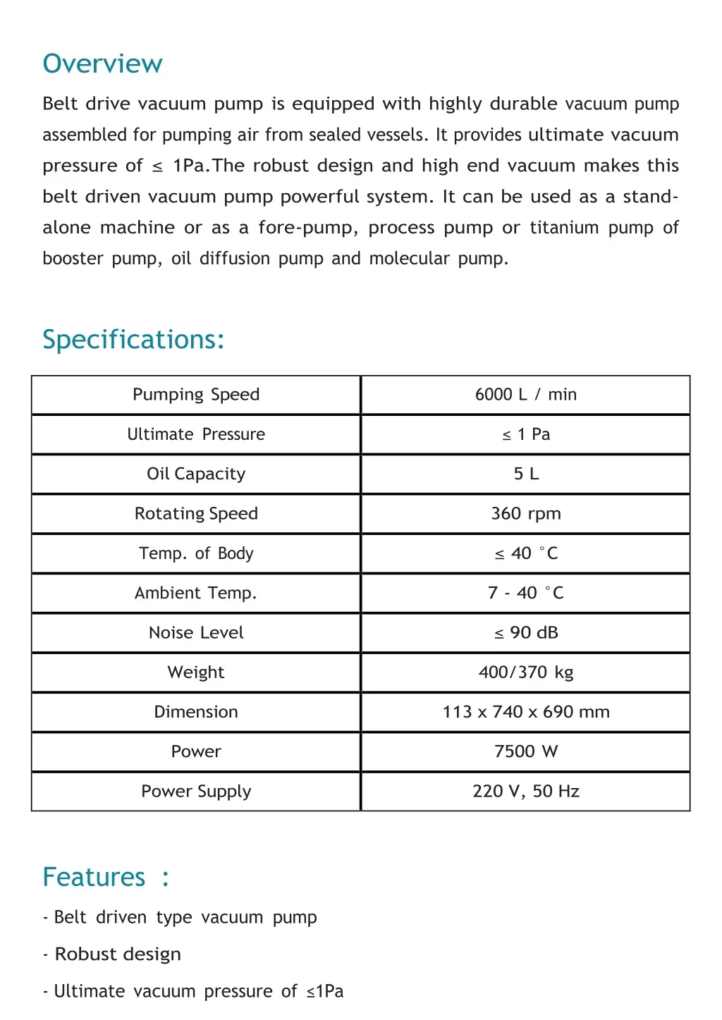 Overview Belt drive vacuum pump is equipped with highly durable vacuum pump assembled for pumping air from sealed vessels. It provides ultimate vacuum pressure of ≤1Pa.The robust design and high end vacuum makes this belt driven vacuum pump powerful system. It can be used as a stand- alone machine or as a fore-pump, process pump or titanium pump of booster pump, oil diffusion pump and molecular pump. Specifications: Pumping Speed 6000 L / min Ultimate Pressure ≤1 Pa Oil Capacity 5 L Rotating Speed 360 rpm Temp. of Body ≤40 °C Ambient Temp. 7 - 40 °C Noise Level ≤90 dB Weight 400/370 kg Dimension 113 x 740 x 690 mm Power 7500 W Power Supply 220 V, 50 Hz Features: -Belt driven type vacuum pump -Robust design -Ultimate vacuum pressure of ≤1Pa