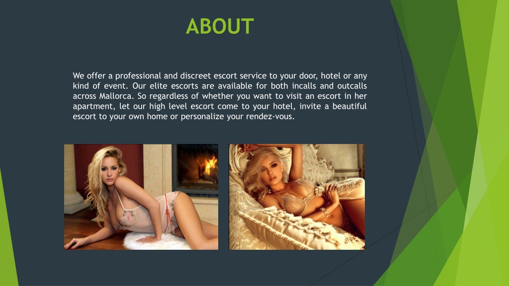 ABOUT We offer a professional and discreet escort service to your door, hotel or any kind of event. Our elite escorts are available for both incalls and outcalls across Mallorca. So regardless of whether you want to visit an escort in her apartment, let our high level escort come to your hotel, invite a beautiful escort to your own home or personalize your rendez-vous.
