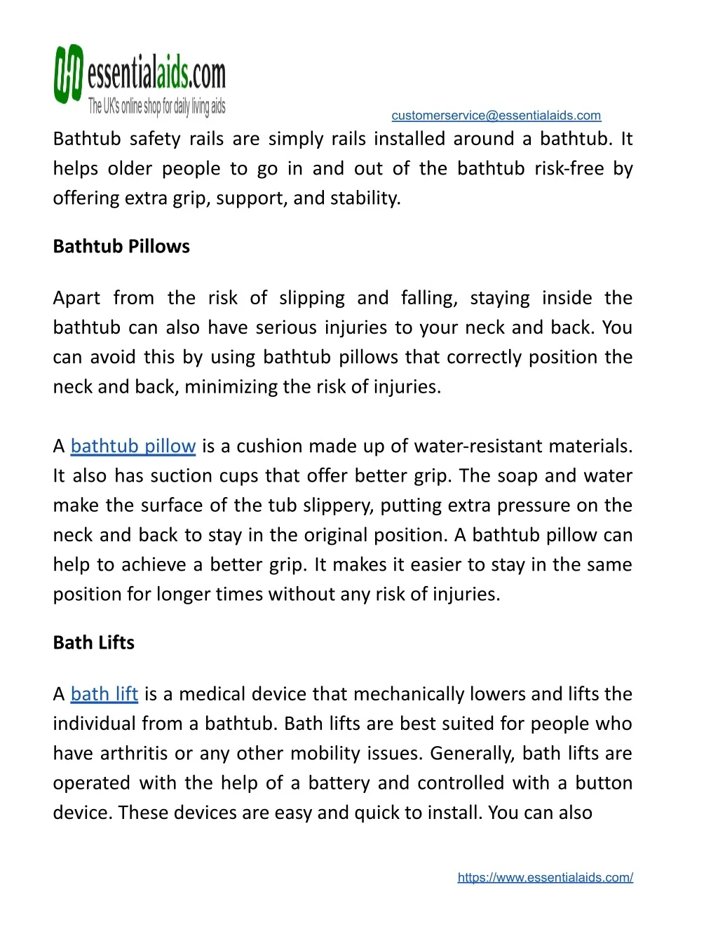 customerservice@essentialaids.com Bathtub safety rails are simply rails installed around a bathtub. It helps older people to go in and out of the bathtub risk-free by offering extra grip, support, and stability. Bathtub Pillows Apart from the risk of slipping and falling, staying inside the bathtub can also have serious injuries to your neck and back. You can avoid this by using bathtub pillows that correctly position the neck and back, minimizing the risk of injuries. A bathtub pillow is a cushion made up of water-resistant materials. It also has suction cups that offer better grip. The soap and water make the surface of the tub slippery, putting extra pressure on the neck and back to stay in the original position. A bathtub pillow can help to achieve a better grip. It makes it easier to stay in the same position for longer times without any risk of injuries. Bath Lifts A bath lift is a medical device that mechanically lowers and lifts the individual from a bathtub. Bath lifts are best suited for people who have arthritis or any other mobility issues. Generally, bath lifts are operated with the help of a battery and controlled with a button device. These devices are easy and quick to install. You can also https://www.essentialaids.com/