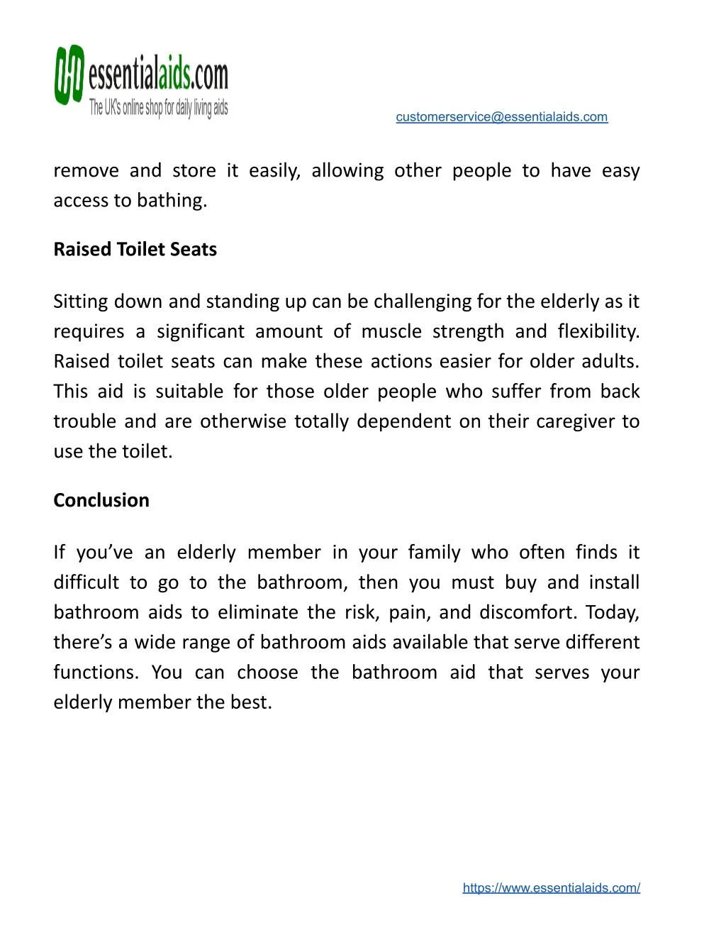 customerservice@essentialaids.com remove and store it easily, allowing other people to have easy access to bathing. Raised Toilet Seats Sitting down and standing up can be challenging for the elderly as it requires a significant amount of muscle strength and flexibility. Raised toilet seats can make these actions easier for older adults. This aid is suitable for those older people who suffer from back trouble and are otherwise totally dependent on their caregiver to use the toilet. Conclusion If you’ve an elderly member in your family who often finds it difficult to go to the bathroom, then you must buy and install bathroom aids to eliminate the risk, pain, and discomfort. Today, there’s a wide range of bathroom aids available that serve different functions. You can choose the bathroom aid that serves your elderly member the best. https://www.essentialaids.com/