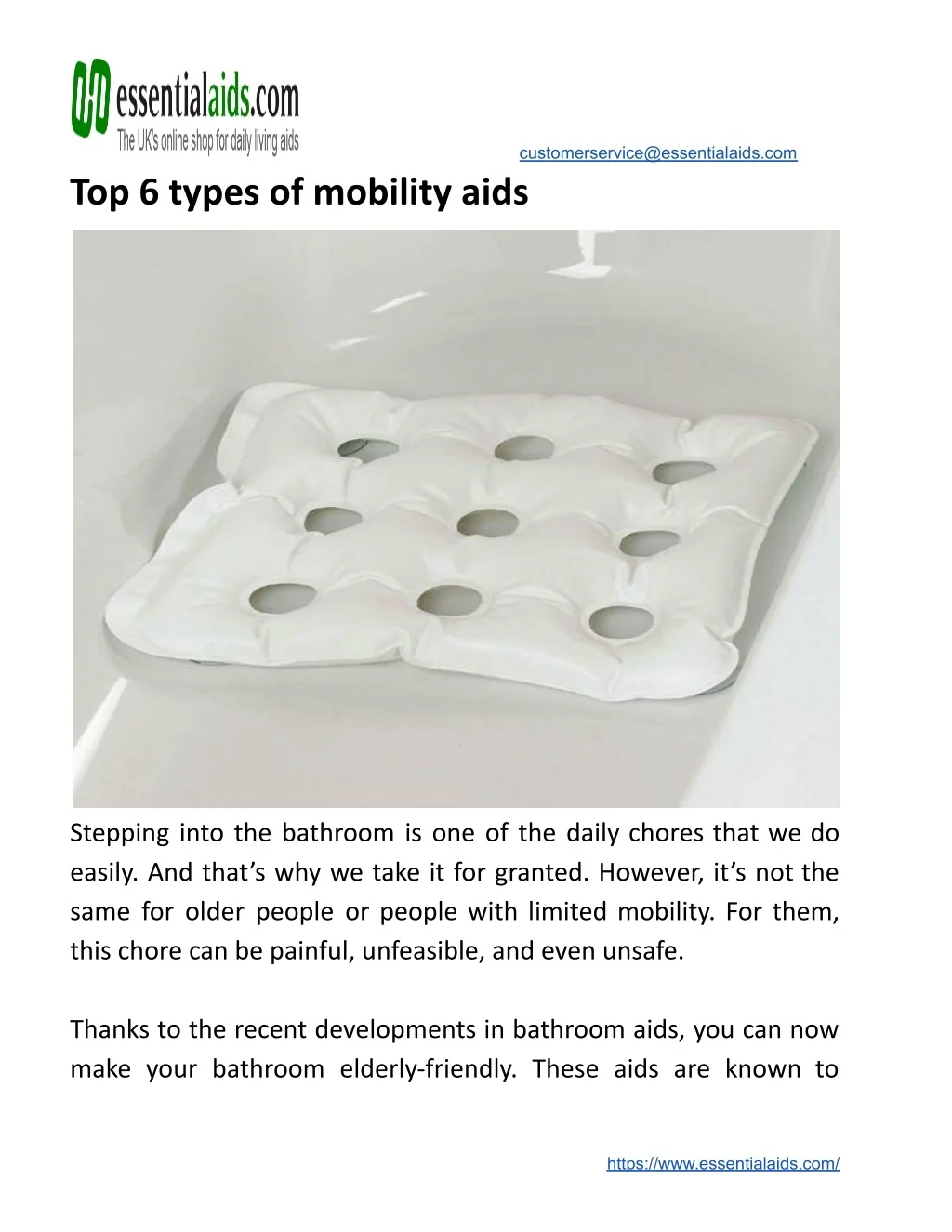 customerservice@essentialaids.com Top 6 types of mobility aids Stepping into the bathroom is one of the daily chores that we do easily. And that’s why we take it for granted. However, it’s not the same for older people or people with limited mobility. For them, this chore can be painful, unfeasible, and even unsafe. Thanks to the recent developments in bathroom aids, you can now make your bathroom elderly-friendly. These aids are known to https://www.essentialaids.com/