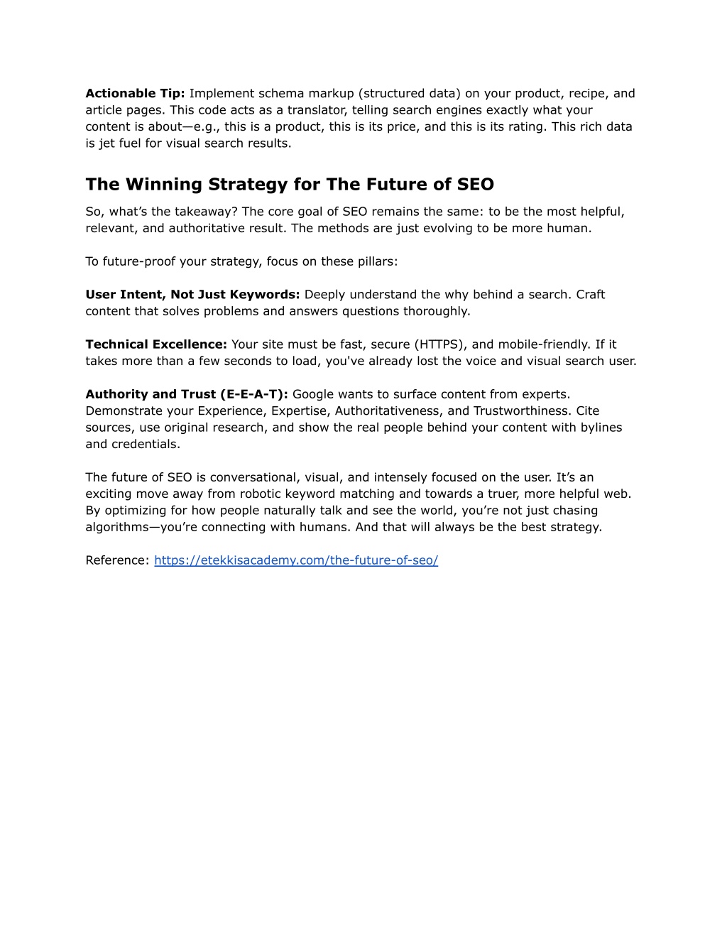 3. Actionable Tip: Implement schema markup (structured data) on your product, recipe, and article pages. This code acts as a translator, telling search engines exactly what your content is about—e.g., this is a product, this is its price, and this is its rating. This rich data is jet fuel for visual search results. The Winning Strategy for The Future of SEO So, what’s the takeaway? The core goal of SEO remains the same: to be the most helpful, relevant, and authoritative result. The methods are just evolving to be more human. To future-proof your strategy, focus on these pillars: User Intent, Not Just Keywords: Deeply understand the why behind a search. Craft content that solves problems and answers questions thoroughly. Technical Excellence: Your site must be fast, secure (HTTPS), and mobile-friendly. If it takes more than a few seconds to load, you've already lost the voice and visual search user. Authority and Trust (E-E-A-T): Google wants to surface content from experts. Demonstrate your Experience, Expertise, Authoritativeness, and Trustworthiness. Cite sources, use original research, and show the real people behind your content with bylines and credentials. The future of SEO is conversational, visual, and intensely focused on the user. It’s an exciting move away from robotic keyword matching and towards a truer, more helpful web. By optimizing for how people naturally talk and see the world, you’re not just chasing algorithms—you’re connecting with humans. And that will always be the best strategy. Reference: https://etekkisacademy.com/the-future-of-seo/