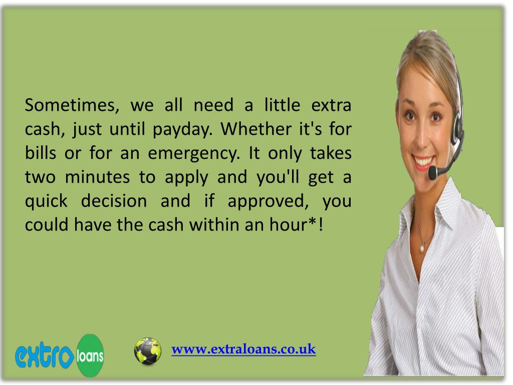 Sometimes, we all need a little extra cash, just until payday. Whether it's for bills or for an emergency. It only takes two minutes to apply and you'll get a quick decision and if approved, you could have the cash within an hour*! www.extraloans.co.uk