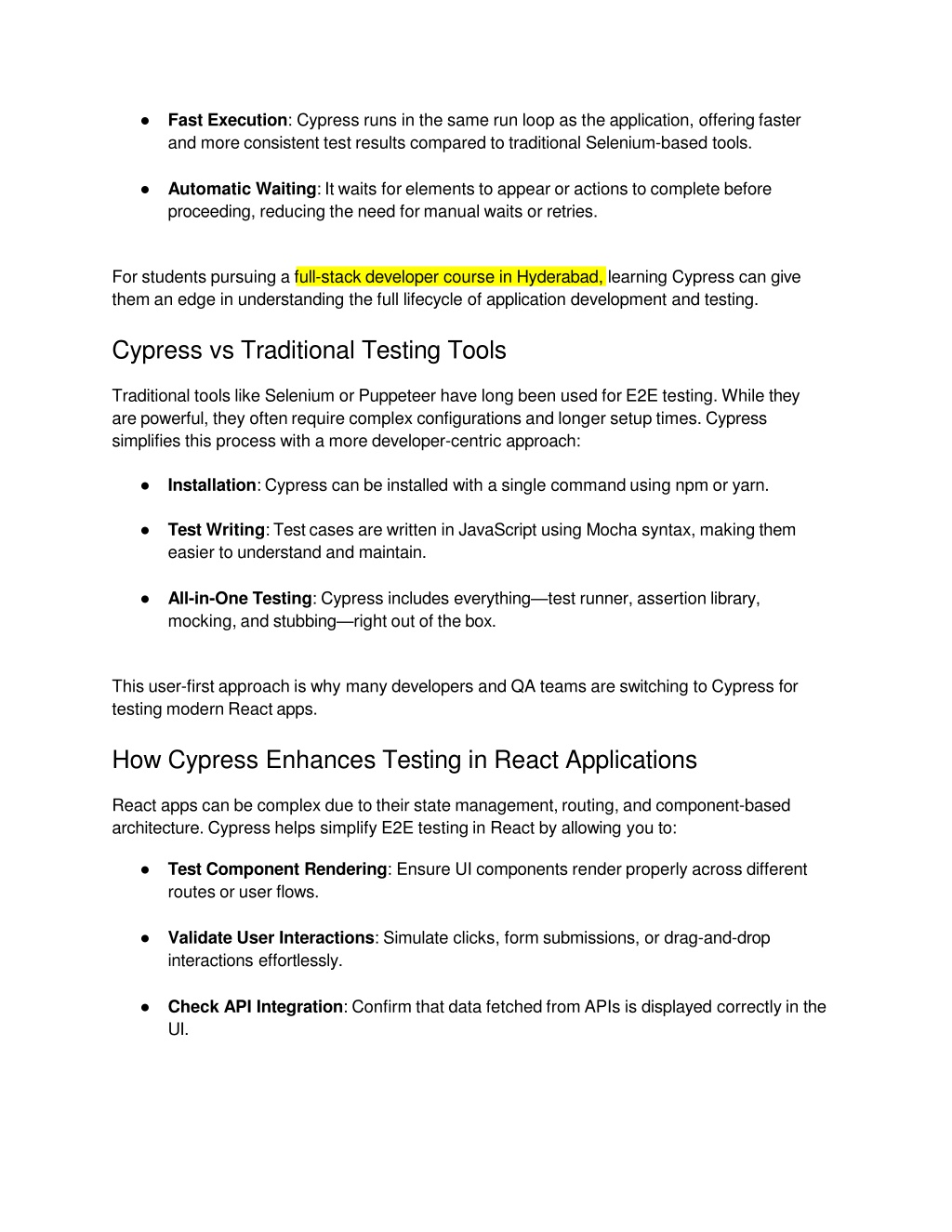 FastExecution:Cypressrunsinthesamerunloopastheapplication,offeringfaster andmoreconsistenttestresultscomparedtotraditionalSelenium-basedtools. • AutomaticWaiting:Itwaitsforelementstoappearoractionstocompletebefore proceeding,reducingtheneedformanualwaitsorretries. • Forstudentspursuingafull-stackdevelopercourseinHyderabad,learningCypresscangive themanedgeinunderstandingthefulllifecycleofapplicationdevelopmentandtesting. • CypressvsTraditionalTestingTools • TraditionaltoolslikeSeleniumorPuppeteerhavelongbeenusedforE2Etesting.Whilethey arepowerful,theyoftenrequirecomplexconfigurationsandlongersetuptimes.Cypress simplifiesthisprocesswithamoredeveloper-centricapproach: • Installation:Cypresscanbeinstalledwithasinglecommandusingnpmoryarn. • TestWriting:TestcasesarewritteninJavaScriptusingMochasyntax,makingthem easiertounderstandandmaintain. • All-in-OneTesting:Cypressincludeseverything—testrunner,assertionlibrary, mocking,andstubbing—rightoutofthebox. • Thisuser-firstapproachiswhymanydevelopersandQAteamsareswitchingtoCypress for testingmodernReactapps. • HowCypressEnhancesTestinginReactApplications • Reactappscanbecomplexduetotheirstatemanagement,routing,andcomponent-based architecture.CypresshelpssimplifyE2EtestinginReactbyallowingyouto: • TestComponentRendering:EnsureUIcomponentsrenderproperlyacrossdifferent routesoruserflows. • ValidateUser Interactions: Simulate clicks,form submissions, or drag-and-drop interactionseffortlessly. • CheckAPIIntegration:ConfirmthatdatafetchedfromAPIsisdisplayedcorrectlyinthe UI.