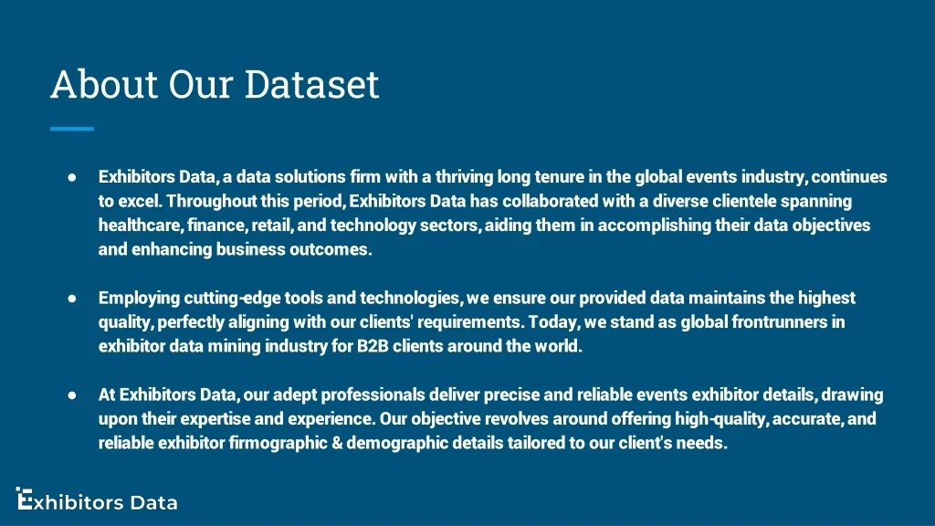About Our Dataset • Exhibitors Data, a data solutions firm with a thriving long tenure in the global events industry, continues to excel. Throughout this period, Exhibitors Data has collaborated with a diverse clientele spanning healthcare, finance, retail, and technology sectors, aiding them in accomplishing their data objectives and enhancing business outcomes. • Employing cutting-edge tools and technologies, we ensure our provided data maintains the highest quality, perfectly aligning with our clients' requirements. Today, we stand as global frontrunners in exhibitor data mining industry for B2B clients around the world. • At Exhibitors Data, our adept professionals deliver precise and reliable events exhibitor details, drawing upon their expertise and experience. Our objective revolves around offering high-quality, accurate, and reliable exhibitor firmographic & demographic details tailored to our client's needs.