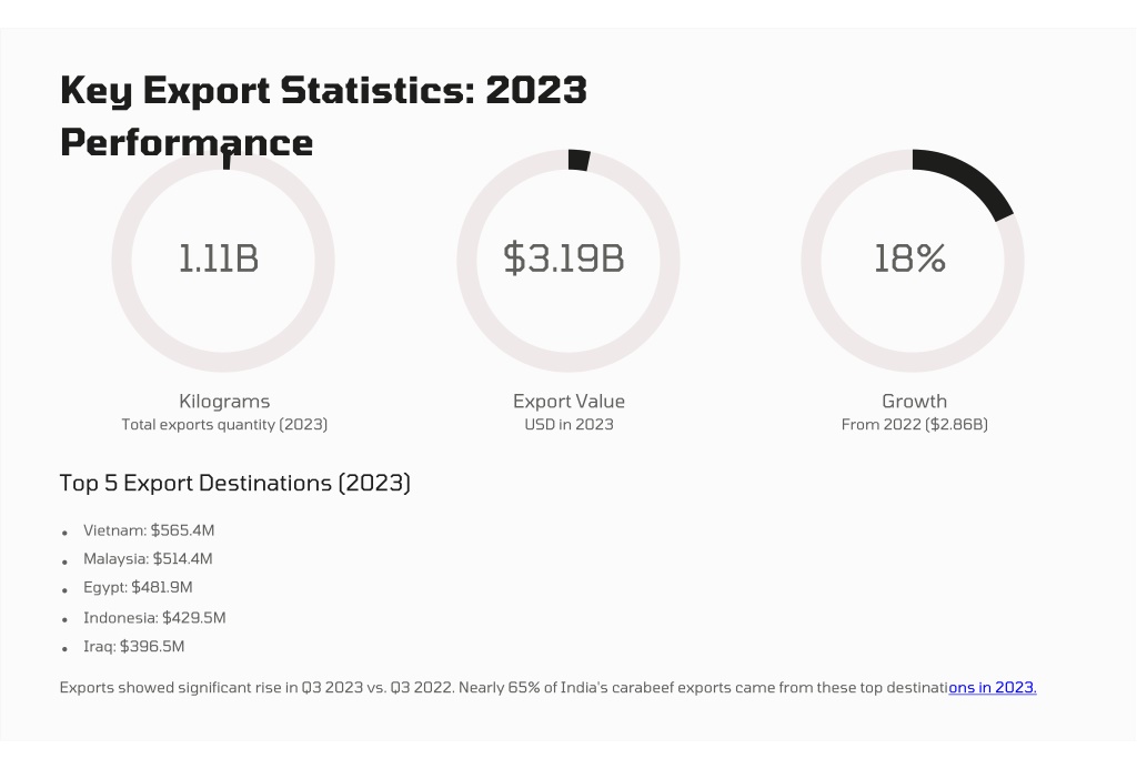 Key Export Statistics: 2023 Performance 1.11B $3.19B 18% Kilograms Total exports quantity (2023) Export Value USD in 2023 Growth From 2022 ($2.86B) Top 5 Export Destinations (2023) Vietnam: $565.4M Malaysia: $514.4M Egypt: $481.9M Indonesia: $429.5M Iraq: $396.5M Exports showed significant rise in Q3 2023 vs. Q3 2022. Nearly 65% of India's carabeef exports came from these top destinations in 2023.