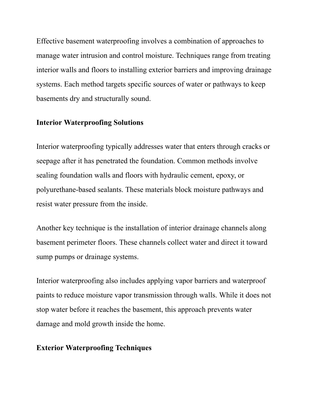 Basement Waterproofing Basics and Effective Solutions for Every Home Basement waterproofing is essential for preventing water damage, mold growth, and structural issues. It involves various methods such as interior sealants, exterior coatings, drainage systems, and sump pumps to keep water from entering a basement. The most effective waterproofing approach depends on identifying the source of the leak and choosing the right combination of solutions for the home's specific needs. Water can seep in through cracks, poor drainage, or high water tables, making it crucial to address both the inside and outside of the basement. Exterior waterproofing uses membranes and drainage systems to stop water before it reaches the foundation, while interior solutions manage water that has already entered. These techniques work together to create a comprehensive defense against moisture and potential damage. Proper basement waterproofing not only protects the home but also maintains its value over time. Homeowners benefit from understanding the available options and selecting professional services tailored to their region’s conditions for long-term success. Basement Waterproofing Methods