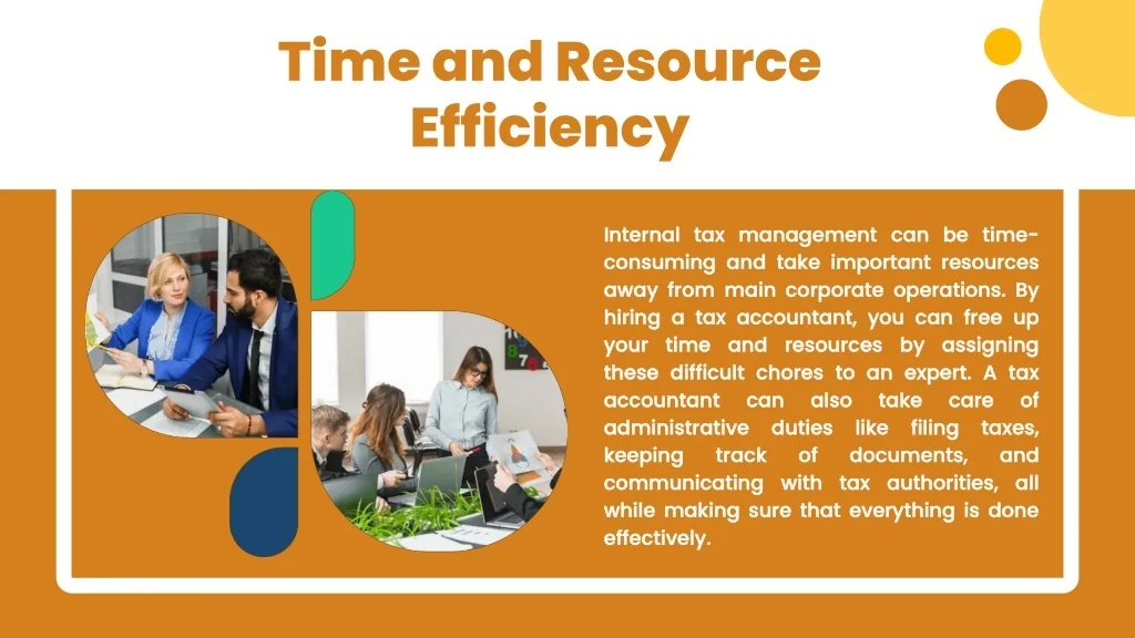 Time and Resource Efficiency Internal tax management can be time-consuming and take important resources away from main corporate operations. By hiring a tax accountant, you can free up your time and resources by assigning these difficult chores to an expert. A tax accountant can also take care of administrative duties like filing taxes, keeping track of documents, and communicating with tax authorities, all while making sure that everything is done effectively.