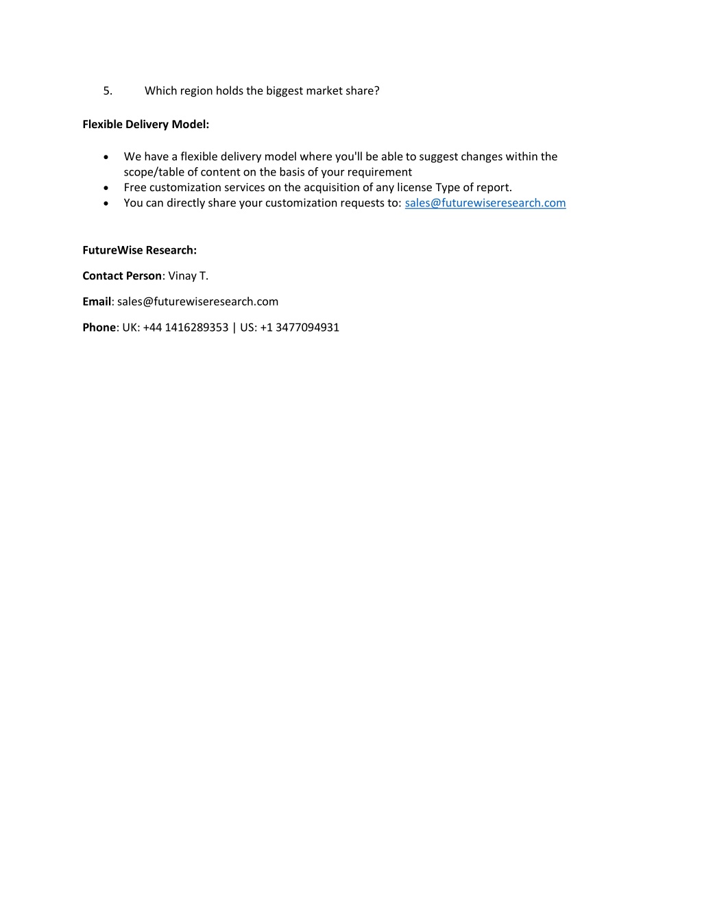 5. Which region holds the biggest market share? Flexible Delivery Model: We have a flexible delivery model where you'll be able to suggest changes within the scope/table of content on the basis of your requirement Free customization services on the acquisition of any license Type of report. You can directly share your customization requests to: sales@futurewiseresearch.com FutureWise Research: Contact Person: Vinay T. Email: sales@futurewiseresearch.com Phone: UK: +44 1416289353 | US: +1 3477094931