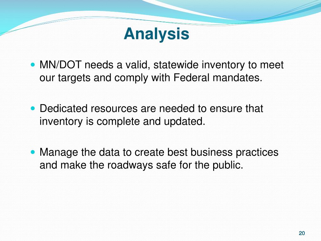 Analysis • MN/DOT needs a valid, statewide inventory to meet our targets and comply with Federal mandates. • Dedicated resources are needed to ensure that inventory is complete and updated. • Manage the data to create best business practices and make the roadways safe for the public. 20 20
