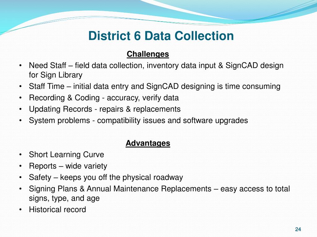 District 6 Data Collection Challenges • Need Staff – field data collection, inventory data input & SignCAD design for Sign Library • Staff Time – initial data entry and SignCAD designing is time consuming • Recording & Coding - accuracy, verify data • Updating Records - repairs & replacements • System problems - compatibility issues and software upgrades Advantages • Short Learning Curve • Reports – wide variety • Safety – keeps you off the physical roadway • Signing Plans & Annual Maintenance Replacements – easy access to total signs, type, and age • Historical record 24