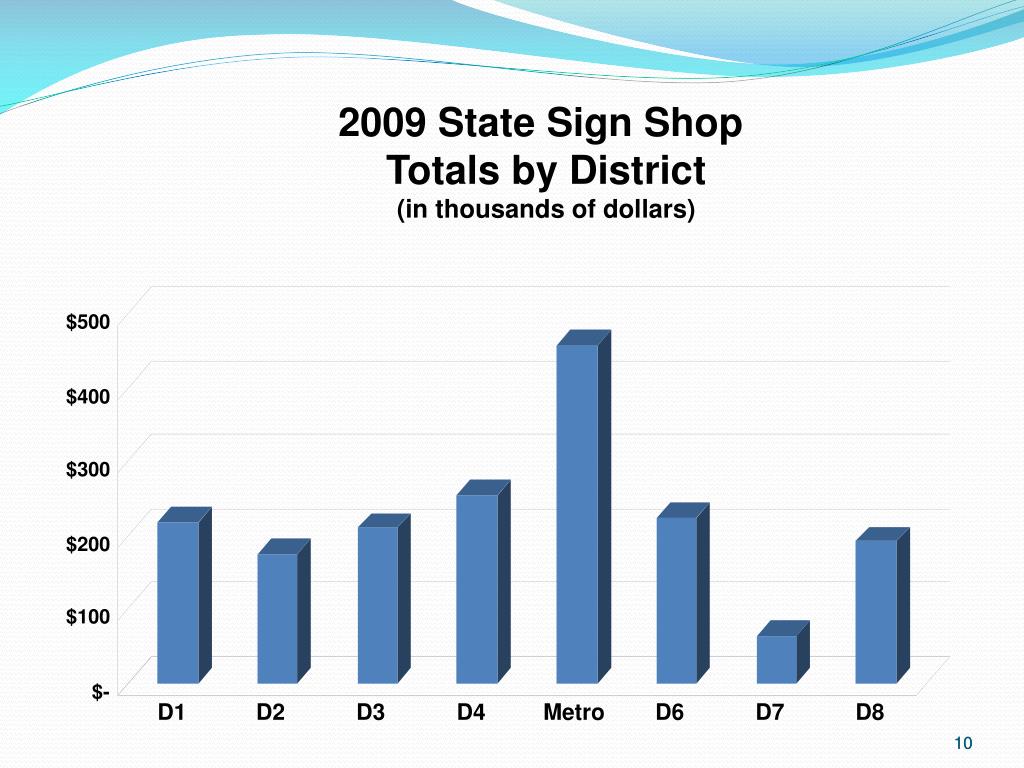2009 State Sign Shop Totals by District (in thousands of dollars) $500 $400 $300 $200 $100 $- D1 D2 D3 D4 Metro D6 D7 D8 10