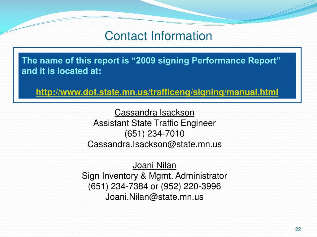 Contact Information The name of this report is “2009 signing Performance Report” and it is located at: http://www.dot.state.mn.us/trafficeng/signing/manual.html Cassandra Isackson Assistant State Traffic Engineer (651) 234-7010 Cassandra.Isackson@state.mn.us Joani Nilan Sign Inventory & Mgmt. Administrator (651) 234-7384 or (952) 220-3996 Joani.Nilan@state.mn.us