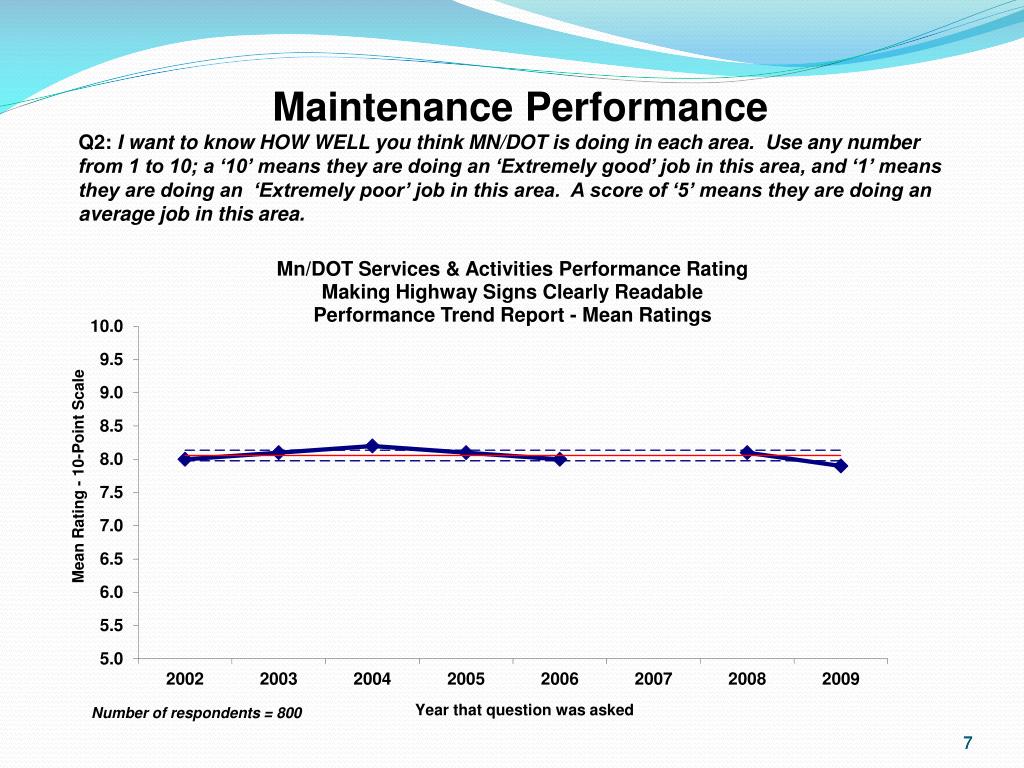 Maintenance Performance Q2: I want to know HOW WELL you think MN/DOT is doing in each area. Use any number from 1 to 10; a ‘10’ means they are doing an ‘Extremely good’ job in this area, and ‘1’ means they are doing an ‘Extremely poor’ job in this area. A score of ‘5’ means they are doing an average job in this area. 7 7