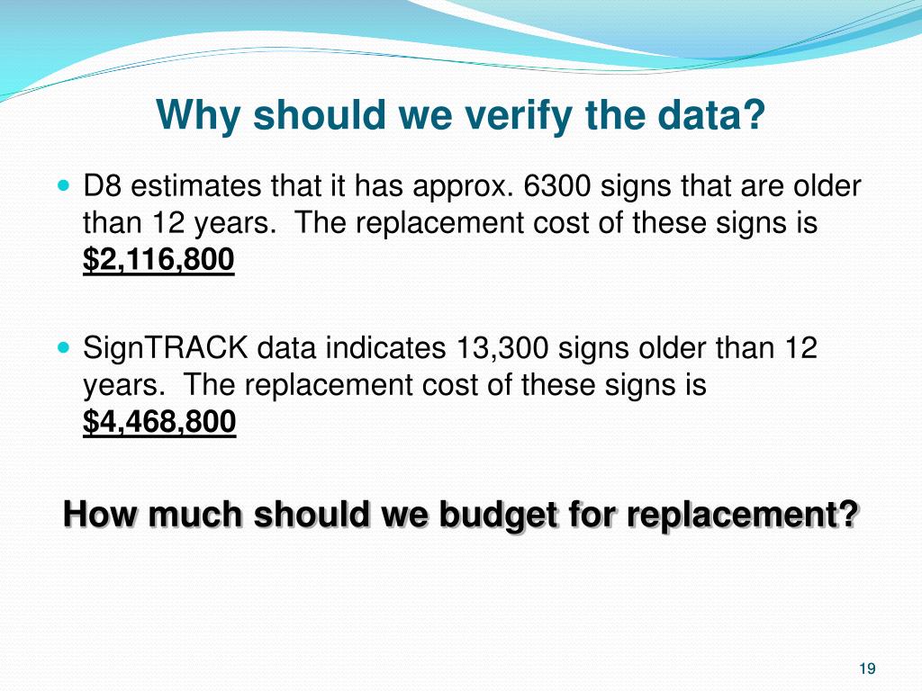 Why should we verify the data? D8 estimates that it has approx. 6300 signs that are older than 12 years. The replacement cost of these signs is $2,116,800 SignTRACK data indicates 13,300 signs older than 12 years. The replacement cost of these signs is $4,468,800 How much should we budget for replacement? 19