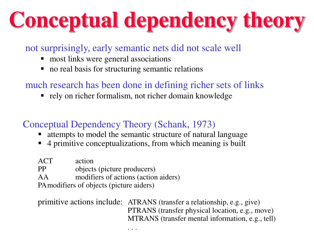 Conceptual dependency theory • not surprisingly, early semantic nets did not scale well • most links were general associations • no real basis for structuring semantic relations • much research has been done in defining richer sets of links • rely on richer formalism, not richer domain knowledge • Conceptual Dependency Theory (Schank, 1973) • attempts to model the semantic structure of natural language • 4 primitive conceptualizations, from which meaning is built ACT action PP objects (picture producers) AA modifiers of actions (action aiders) PA modifiers of objects (picture aiders) primitive actions include: ATRANS (transfer a relationship, e.g., give) PTRANS (transfer physical location, e.g., move) MTRANS (transfer mental information, e.g., tell) . . .